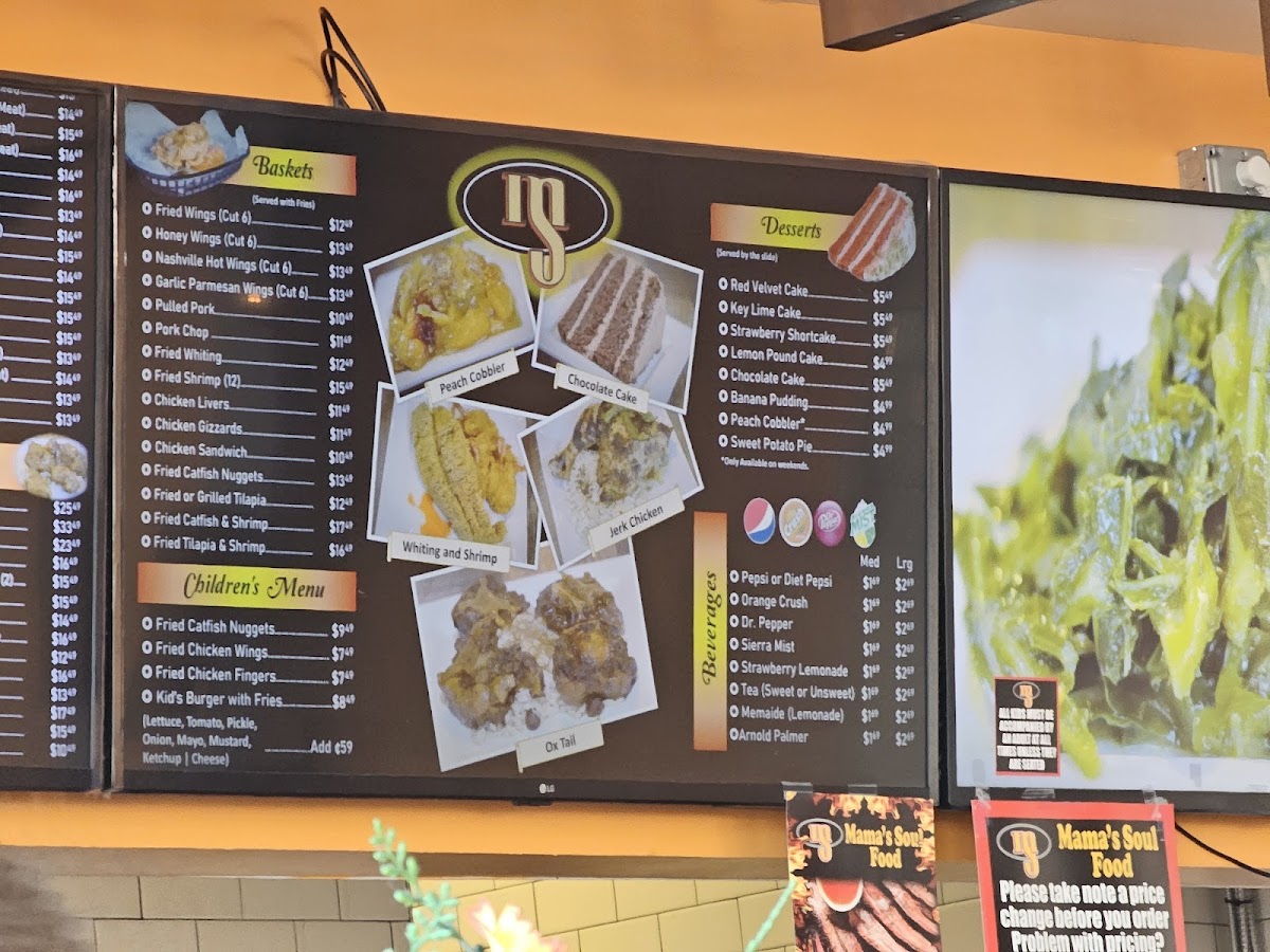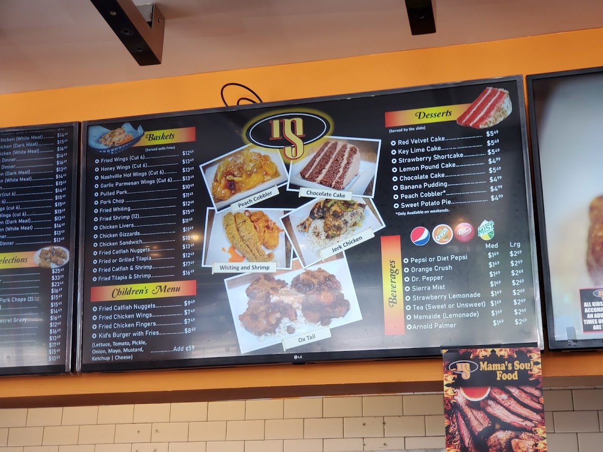 The chicken selections are a standout, featuring mouthwatering dishes like the 1/2 Jerk Chicken Dinner and the 1/4 Baked Chicken, both designed to transport you straight to comfort food bliss. Let's not overlook the luscious desserts, including Banana Pudding and Chocolate Cake, perfect companions to round out your meal.